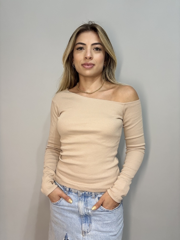 Nossa best seller. Essa blusa de manga longa une conforto e personalidade na medida certa. Feita em ribana macia, tem modelagem ajustada ao corpo e um decote assimétrico que destaca o colo de forma sutil e elegante. Perfeita para elevar produções minimalistas com um toque moderno — do jeans à alfaiataria.